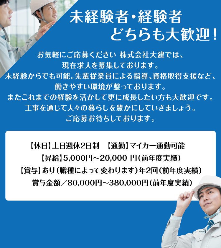 (株)大建は少人数でアットホームな雰囲気があり、社員同士で作業の工程や方法など気さくに相談できる職場であるとともに、子どもの行事などの際、比較的休みが取りやすい和気あいあいとした職場であると思います。